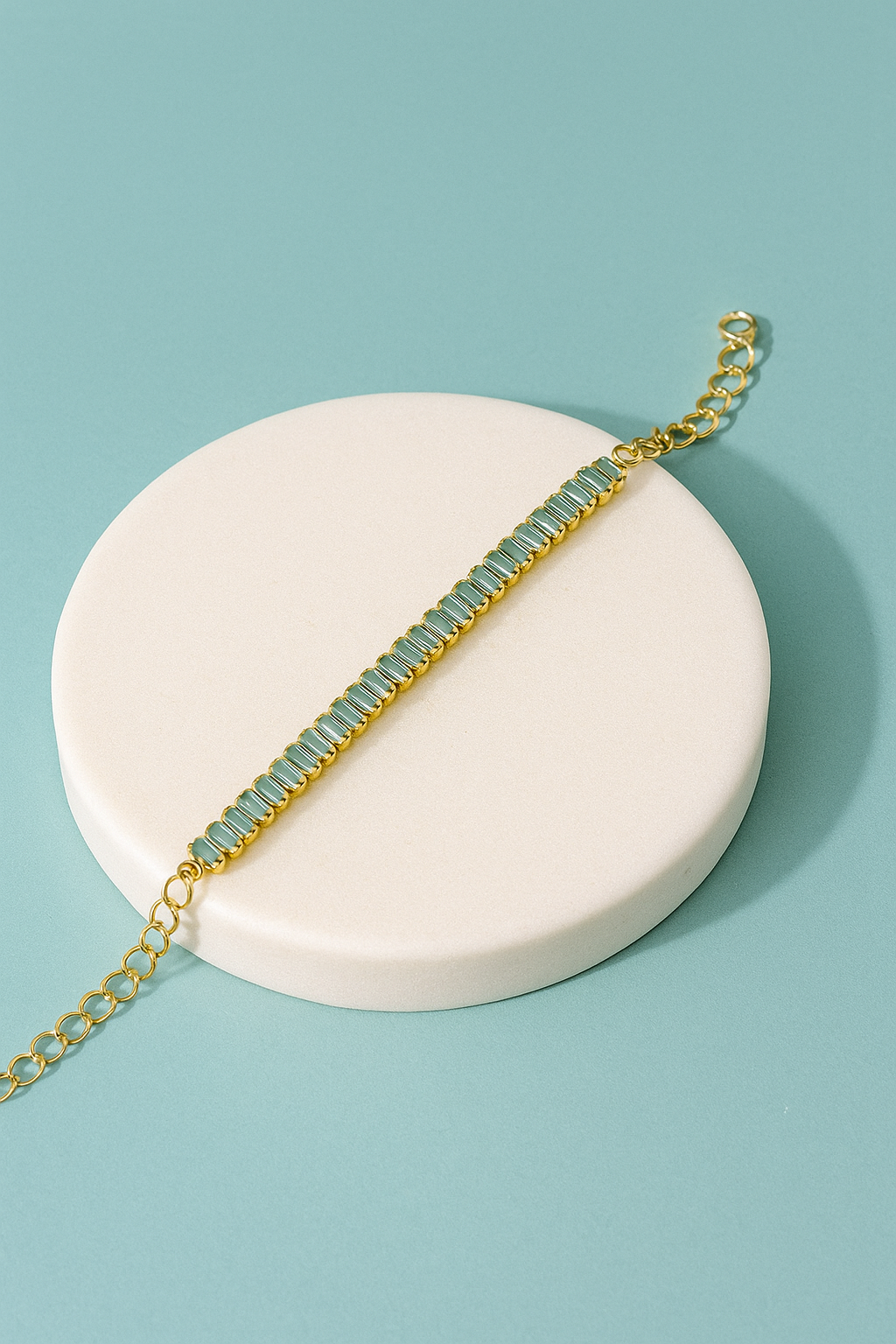 Add a refined touch to your jewelry collection with this Rectangular Gemstone Bracelet, designed to exude timeless elegance. Featuring a sleek gold-plated chain and a stunning rectangular-cut gemstone, this bracelet is available in three elegant shades — Blue, White, and Bronze. The radiant gemstones catch the light beautifully, enhancing both casual and formal looks. Its adjustable clasp ensures a secure and comfortable fit, while the premium finish offers lasting shine and durability. Perfect for daily wear, evening events, or gifting, this bracelet brings sophistication to every occasion.