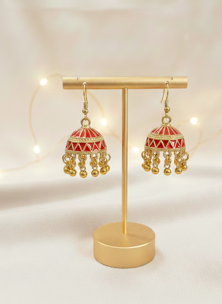 Enhance your festive and traditional look with these beautifully crafted red and antique gold jhumka earrings. Designed with rich red enamel detailing and a soft matte antique gold finish, these earrings offer a more natural and premium look.